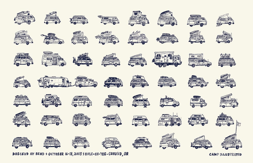 Descend on Bend - The magical event that takes place at Hole-in-the-Ground, OR every year - where, against all odds, several hundred adventuremobile's and their inhabitants gather for a weekend to enjoy life together, make new friends, and geek out on the freedom vessels that allow them to live this abundant life! Arriving early, when there existed only a handful of us, I set out with the lofty goal to sketch each vehicle/home that arrived and consequently get to meet everyone in the process. Fortunately way too many people attended and I couldn't balance the sketching with the hanging out - but here are the adventuremobile's that made it.